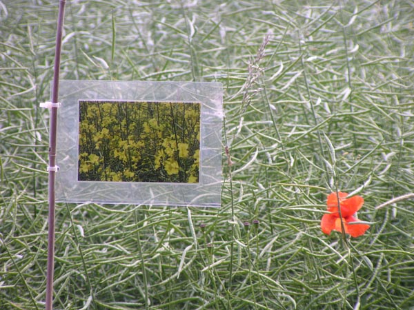 Feldzeichen 2009 Installation am Feldrand, (Müllerweg, Großgoltern) 52 Bambusstäbe, ca.230 - 250 cm Fotos und Texte, laminiert, 15 x 21 cm, Kabelbinder |